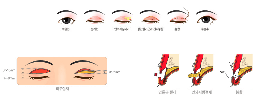 이러한 절개법의 적절한 대상은 눈의 크기, 눈꺼풀조직의 상태, 안검하수의 동반유무, 환자분이 원하는바 기대치 등등을 고려하여 결정하게 됩니다. 보통의 경우 수술 전 상담을 통해 간단한 기구로 라인을 임시로 잡아 보았을 때 라인이 잘 잡히지 않는 경우, 눈꺼풀의 처진 피부가 많은 경우, 절개법으로 이미 수술하고 다시 재수술을 고려하는 경우, 눈꺼풀의 구성요소(근육, 피부 등)들이 두툼한 경우 등이 주로 절개법의 대상이 됩니다.