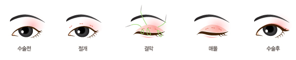 매몰법은 부기가 적고 절개로 인한 흉터가 별로 남지 않기 때문에 최근 많이 시행하는 방법입니다.눈꺼풀이 얇고 지방이 많지 않은 눈을 가진 분이 자연스러운 쌍꺼풀을 원할 때 적당하며 피부를 절개하지 않고 눈꺼풀에 세 군데의 작은 구멍을 내어 피부와 눈뜨는 근육을 연결하여 쌍꺼풀을 만들게 됩니다.